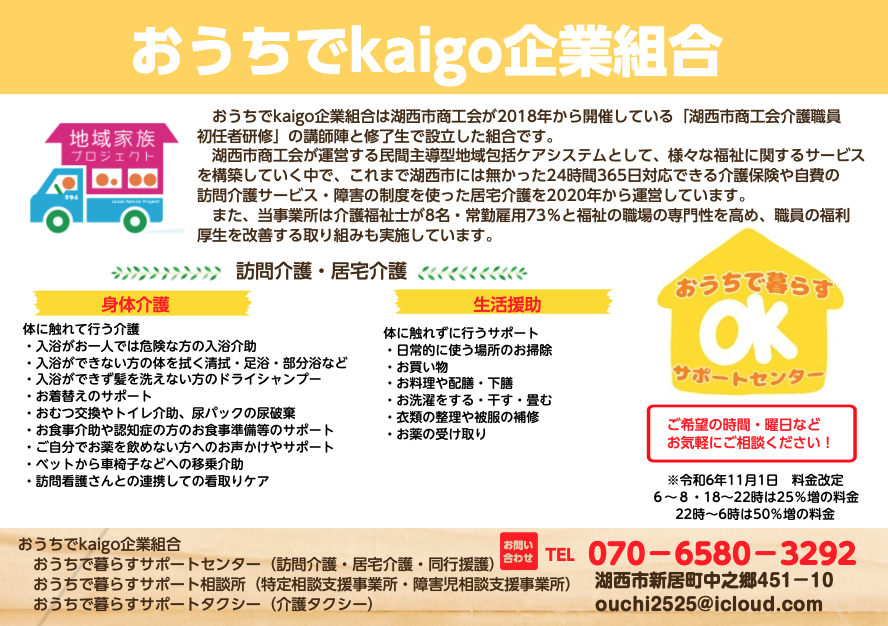 :代表理事 神谷 尚世 (社会福祉士・介護福祉士・准看護師・福祉住環境コーディネーター1級) 理 事 坂井 真央 (介護福祉士・普通二種免許) 理 事 山本 洋人 (作業療法士・介護福祉士・相談支援専門員) |