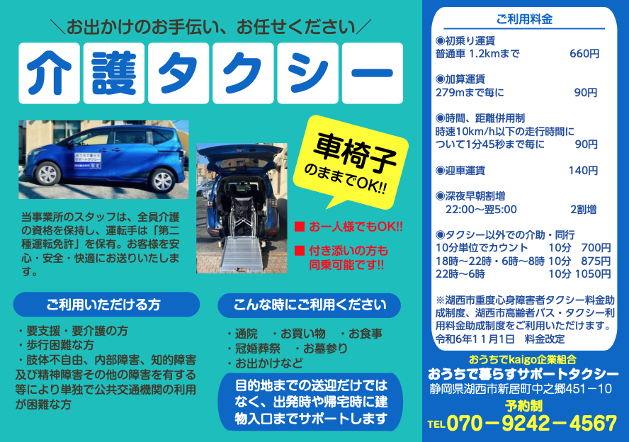 | 料金 | :サービス内容と介護保険や障害サービスの 負担割合によって料金が変わります。 |